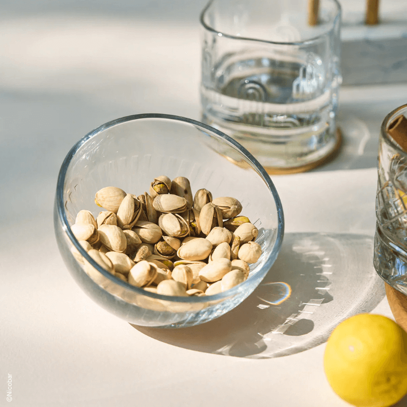 Les coupes Ouessant revisitent avec élégance le verre cannelé inspiré des cales de canots bretons, offrant une texture fine qui capte la lumière avec délicatesse.