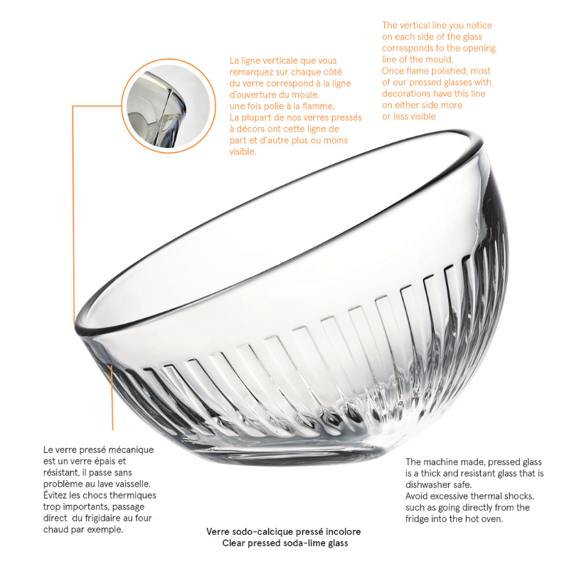Comme tous les verres pressés à décor, il peut présenter une fine ligne verticale issue de l’ouverture du moule, polie à la flamme : une signature discrète qui témoigne d’un savoir-faire artisanal allié à une technique maîtrisée.