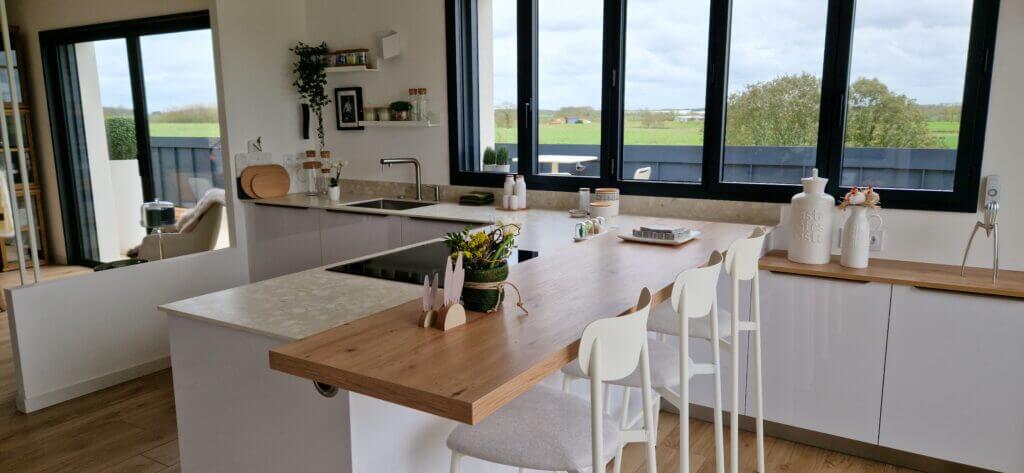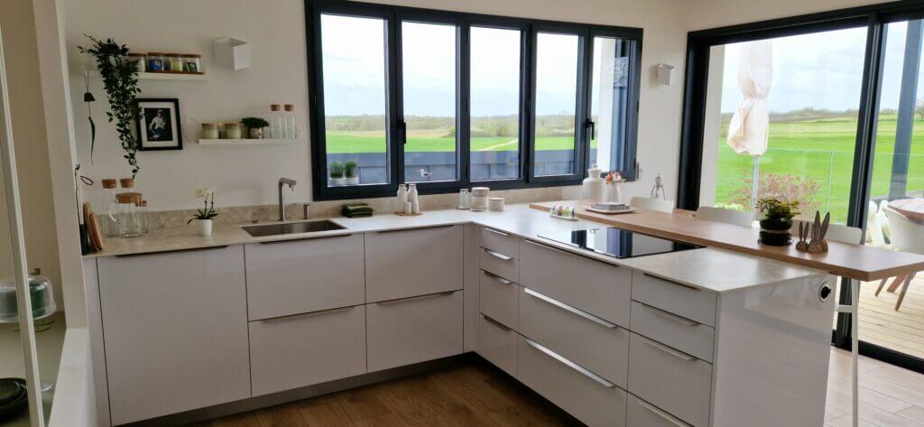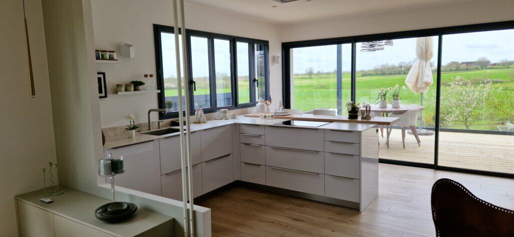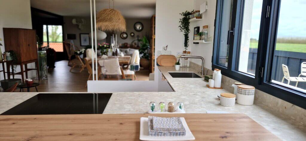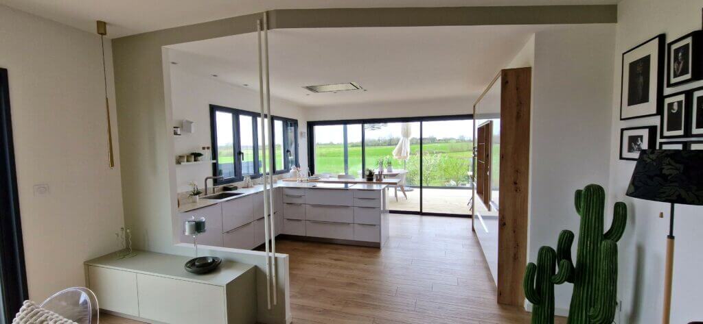 La campagne borde cette maison neuve, l’esprit authentique donné à l’espace de vie avec des matériaux naturels comme le bois, le rotin, la paille, le lin… lui confère une ambiance « campagne chic ». Le souhait des clients étaient d’avoir une cuisine contemporaine et tournée vers un paysage à la dominante végétale et surtout un horizon à couper le souffle !
