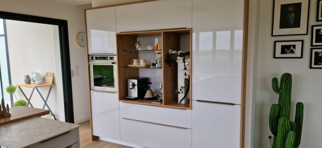 Le pan d’armoires est constitué en son centre d’une grande niche, pour le petit électroménager et la décoration, et de chaque côté, le réfrigérateur encastré, le four et de nombreux grands rangements.