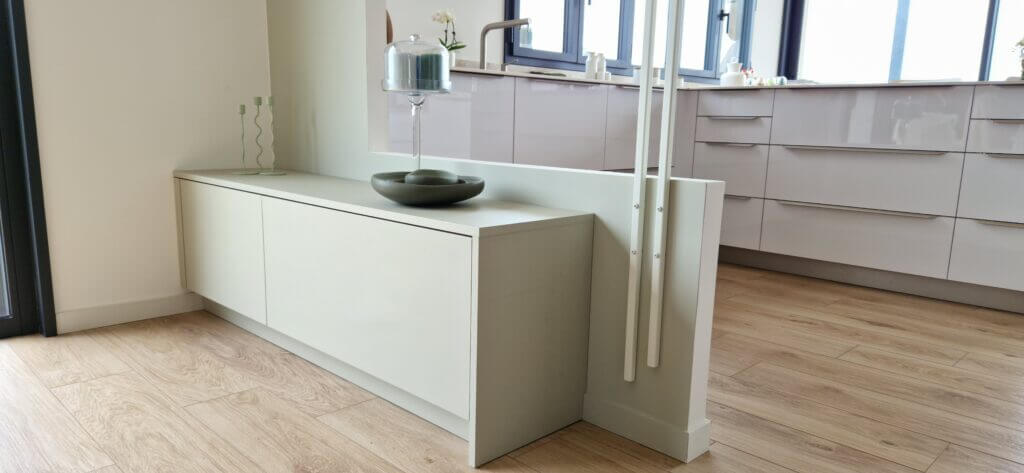 Pour laisser la part belle à la mise en décoration de l’étage, la cuisine s’est parée d’une finition blanc brillante sur les façades, cela apporte une touche design et reflète la lumière, qui contribue à agrandir visuellement l’espace. Nous avons ajouté un peu de bois, disposé à quelques endroits pour sa chaleur.