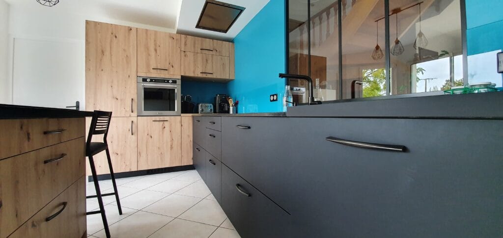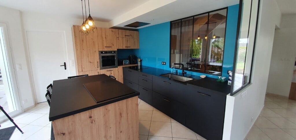 Pour ce projet, nous avons conçu une cuisine bois et noir avec un mur bleu et une crédence de la même couleur. Un ilot central, avec rangements, billot en granit et espace repas, a été installé complété de trois luminaires suspendus au-dessus.