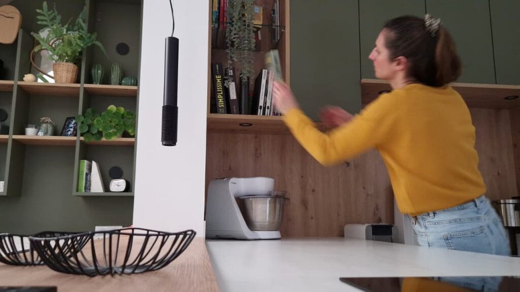 Cette cuisine a été conçue sans poignées, la prise en main des portes et tiroirs se fait grâce à des « gouttières » de coloris noires sur le dessus, dessous ou sur le côté et des « pousse-lâches » (ouverture par une simple pression sur la porte) sont positionnés sur certains éléments.