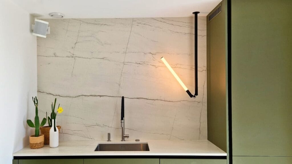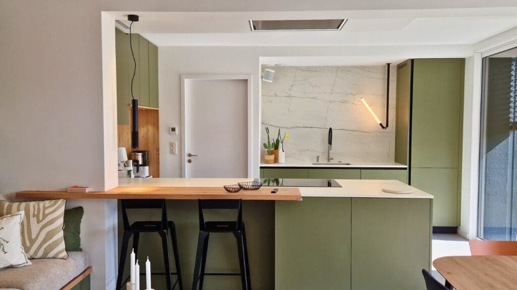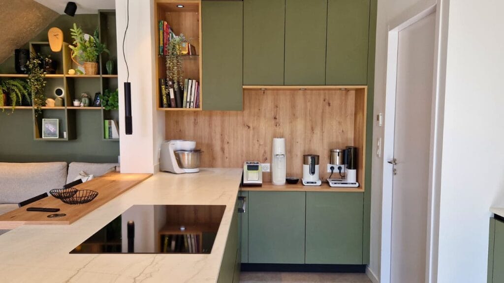 Les clients souhaitaient des tons naturels : minéral, vert, bois. La domination du vert kaki a fière allure dans cet ensemble, elle est au cœur de la décoration. Le plan de travail en céramique « Mont Blanc » se marie parfaitement et apporte un esprit frais et moderne. L’ajout des éléments de bois souligne et mettent en valeur les meubles.