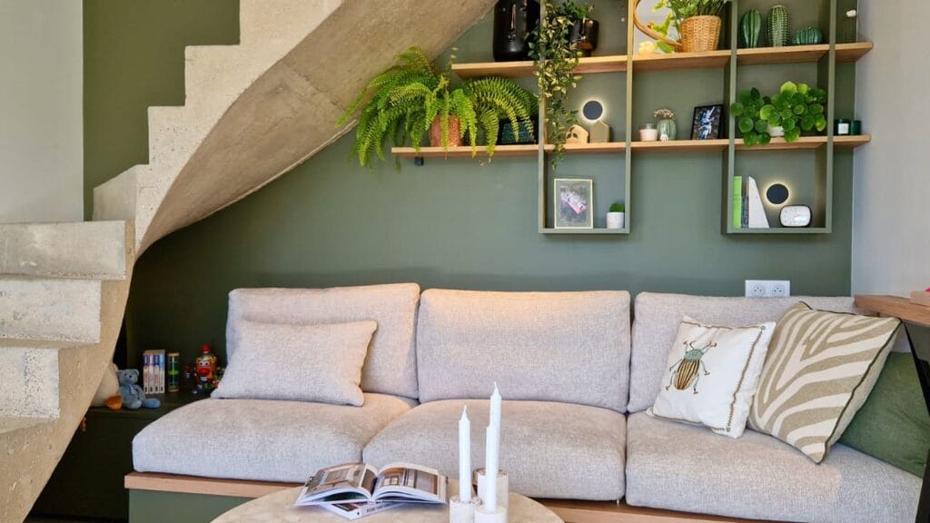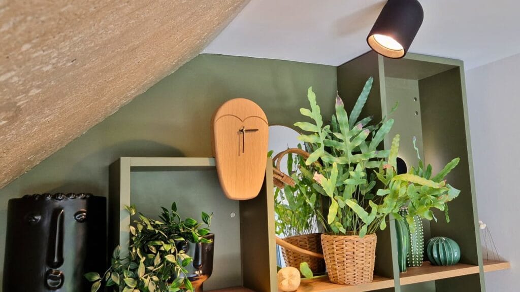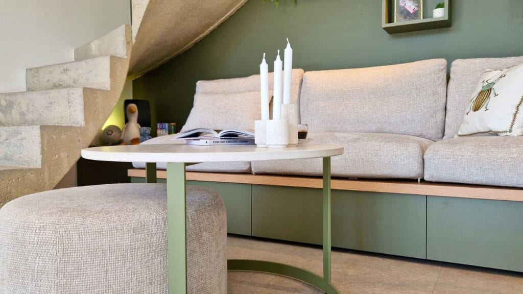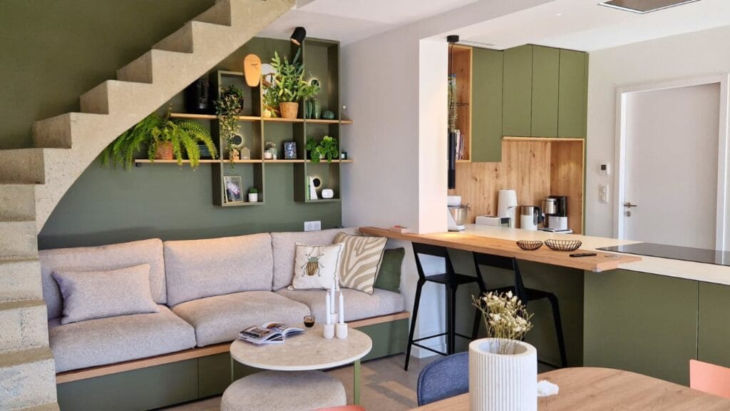 Un salon d’appoint à proximité invite à la détente et toujours en contact avec le cuisinier ! La banquette est composée de 3 grands coussins assises/dos confort plumes de meubles bas à tiroirs, un grand caisson sous escalier et au mur, une composition d’étagères et de niches sur fond vert de la même couleur que la cuisine.
