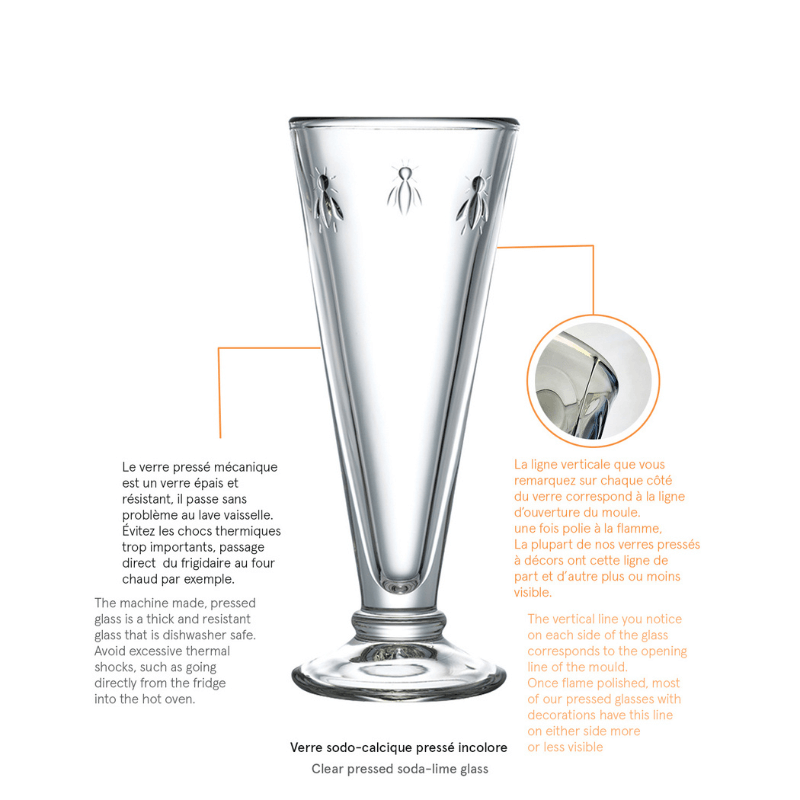 Fabriqué en France, ce verre épais et résistant est conçu pour un usage quotidien. Il passe sans difficulté au lave-vaisselle, ce qui le rend aussi pratique qu’esthétique. Toutefois, il est recommandé d’éviter les chocs thermiques trop importants. Comme tous les verres pressés à décor, il peut présenter une fine ligne verticale issue de l’ouverture du moule, polie à la flamme : une signature discrète qui témoigne d’un savoir-faire artisanal allié à une technique maîtrisée.