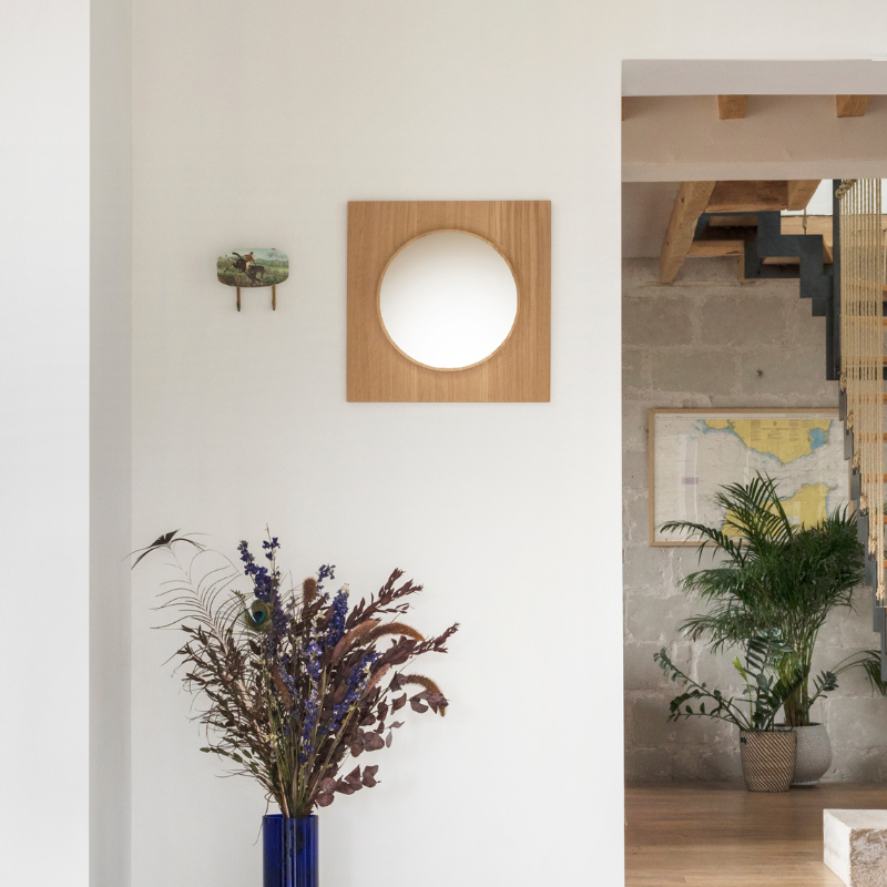 Le miroir Circuit rond— taillé dans du chêne massif creusé pour ne laisser qu’un fin liseré de bois autour du miroir. Sobre, peu encombrant, il révèle l’élégance du matériau brut tout en diffusant une lumière douce, pour sublimer toute pièce.