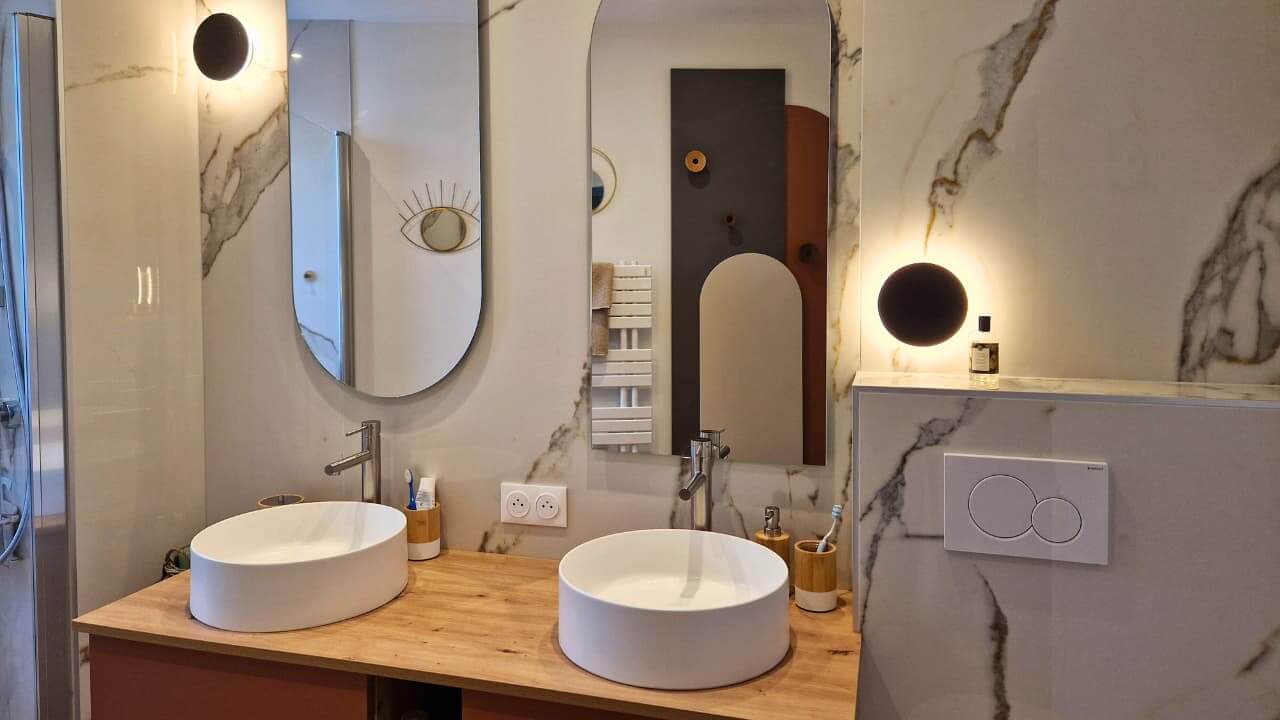 Au-dessus, nous avons installé deux miroirs en arche inversée. Leur forme graphique et contemporaine confère à la salle de bain une identité singulière, tout en apportant profondeur et luminosité à l’espace. Chaque détail a été pensé pour créer un équilibre visuel harmonieux.