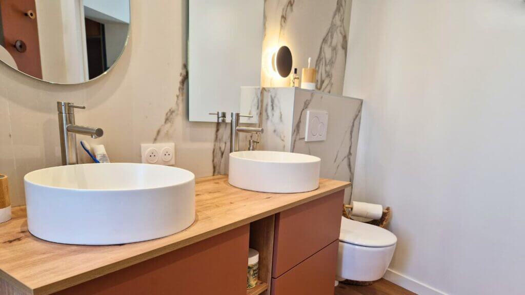 L’élément central de la pièce est un grand meuble vasque sur mesure de couleur terracotta, doté de tiroirs spacieux pour répondre aux besoins de rangement de toute la famille. Son plan de toilette en bois accueille deux vasques circulaires blanches au design épuré, accompagnées de robinets de la marque Bradano, réputée pour la qualité et l’élégance de ses collections. Cet ensemble associe confort d’utilisation et finition haut de gamme.