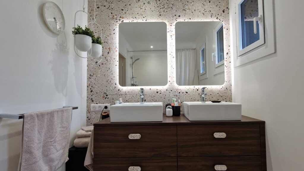 Les miroirs rétroéclairés et chauffants apportent une touche contemporaine, tout en assurant un confort d’utilisation optimal, même après une douche chaude. Un projet où chaque détail a été pensé pour sublimer l’usage quotidien.