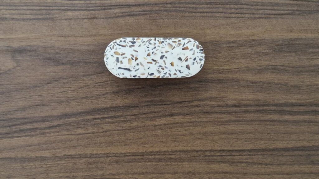 Les poignées en coquillages valorisés, signées Malakio, viennent ponctuer l’ensemble avec raffinement et singularité, en résonance parfaite avec le carrelage mural et au sol. Ce revêtement effet terrazzo, lumineux et graphique, structure l’espace avec caractère, tandis que de grands carreaux blancs mats ont été choisis pour sublimer la zone bain.