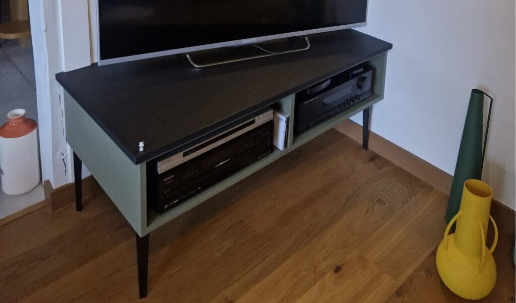 Nous avons installé des niches avec une structure en métal, un petit meuble suspendu et un meuble de télévision sur pieds.